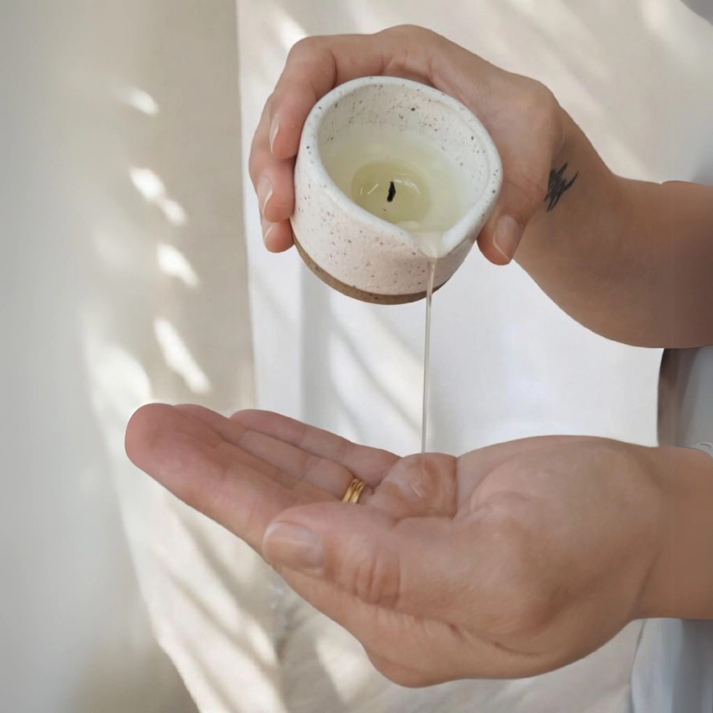 Uma vela de massagem com óleos essenciais de lavanda, patchouli e lemongrass (50g), que derrete em um óleo morno para momentos de toque e conexão.